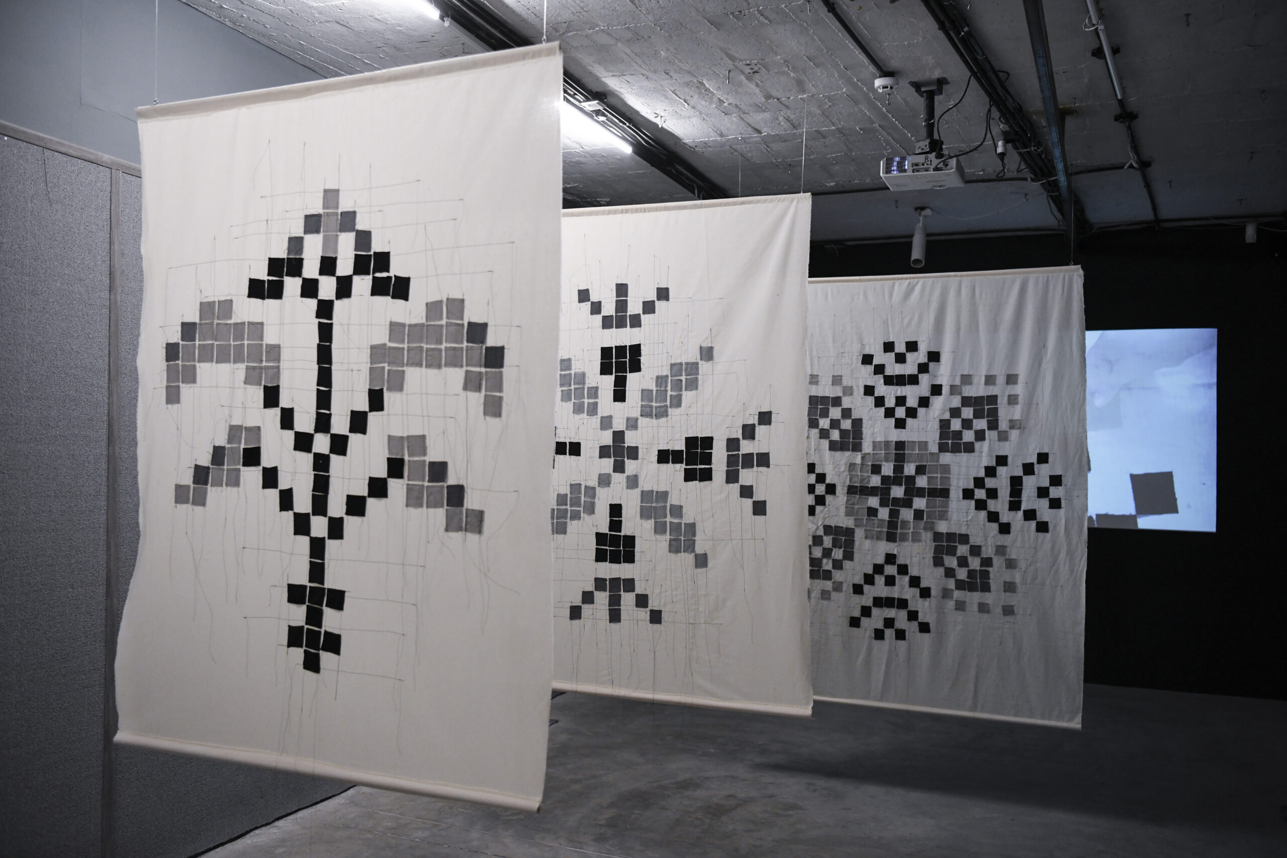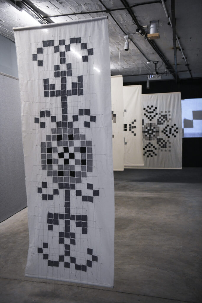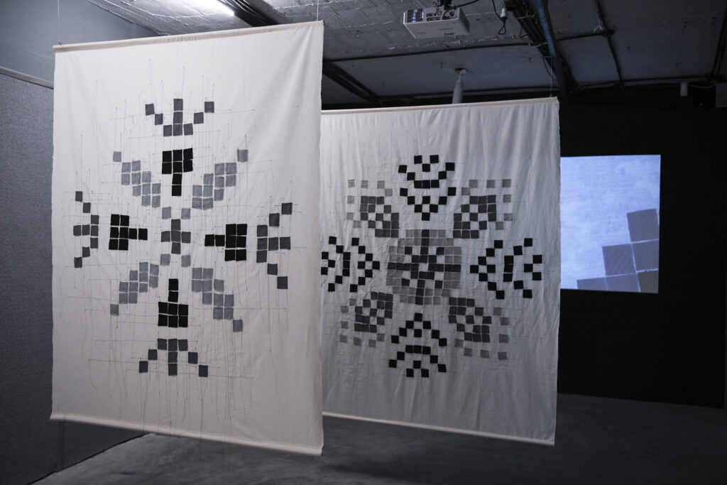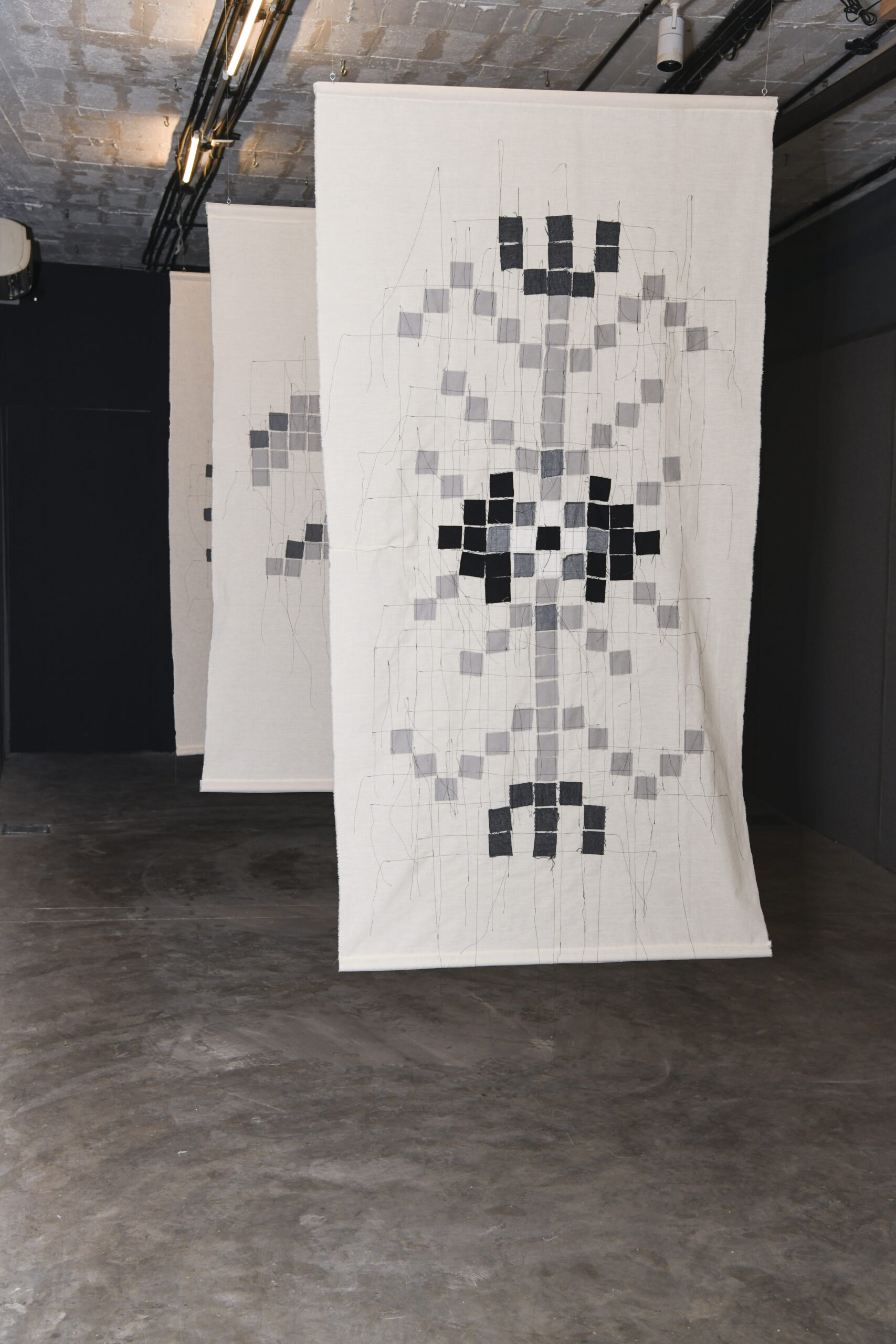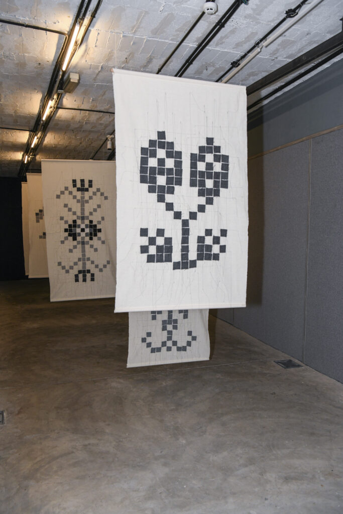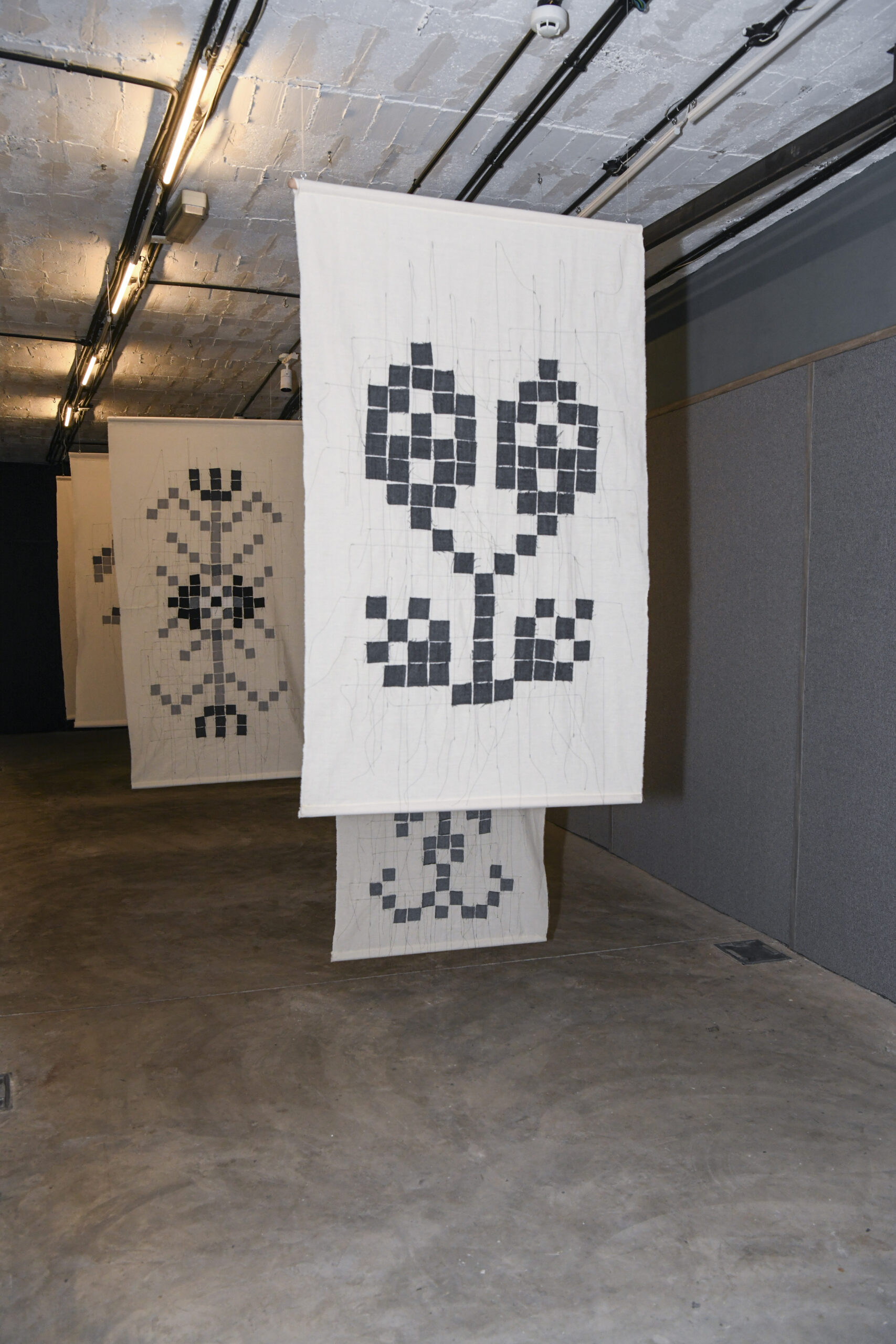 The motifs are further translated into black-and-white textile collages, each serving as a blueprint—a tactile map of the plants and the stories they hold.