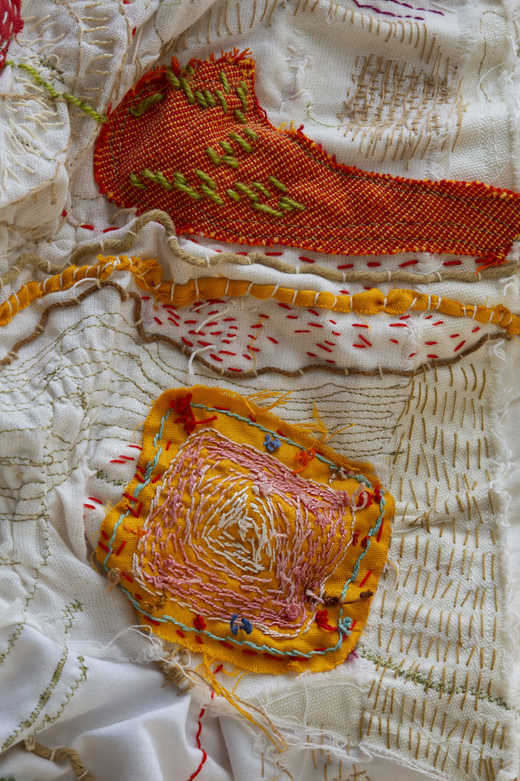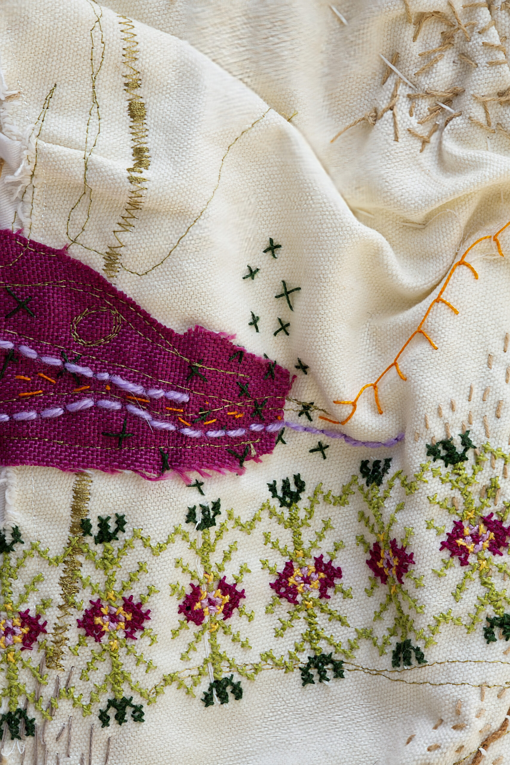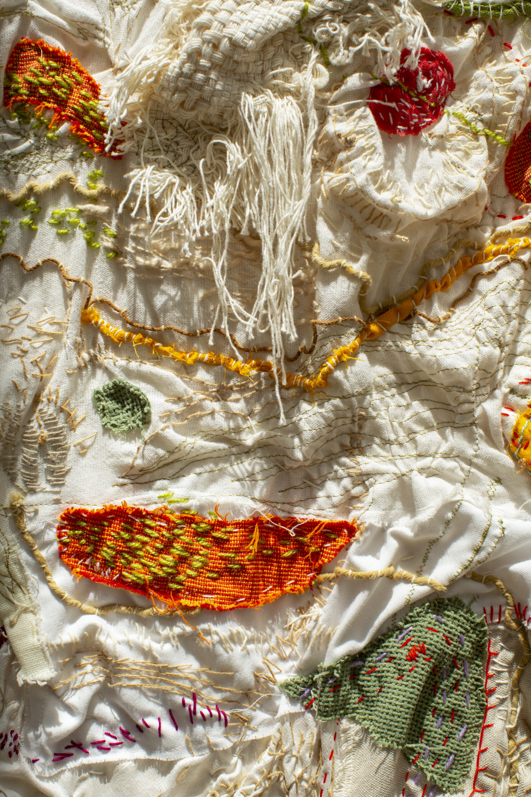 In this sprawling embroidery piece, against my stitched backdrop of mountains and valleys, hills and fields, emerges a story of resistance. For countless generations, Palestinians have foraged for and harvested the fruits of their land, from the naturally growing tumble thistle (Akkoub), medicinal thyme (Za’atar), and wild sage (Meramieh) to the cultivated olive, orange, and watermelon. Yet, like all other facets of their lives, their autonomy over their own food is under occupation. In addition to confiscating their farmlands and uprooting thousands of generational fruit trees, Israel imposes oppressive laws forbidding Palestinians from picking and growing the plants that comprise their culinary, medicinal, and cultural traditions. Despite this, Palestinians continue to find ways to resist. To symbolize this struggle, I’ve created original motifs of these plants, disrupting the landscape with their rich reds, warm oranges, verdant greens, and deep purples in an act of rebellion against the background’s muted color palette. Transcending mere fabric, this tapestry stands as a tribute to the enduring spirit of the Palestinian people and their ongoing struggle for survival, self-determination, and freedom.