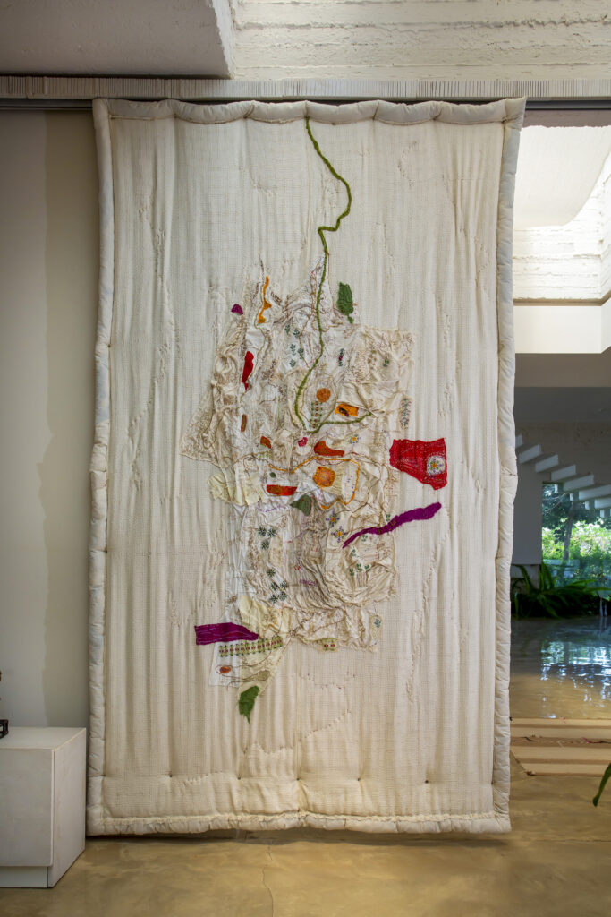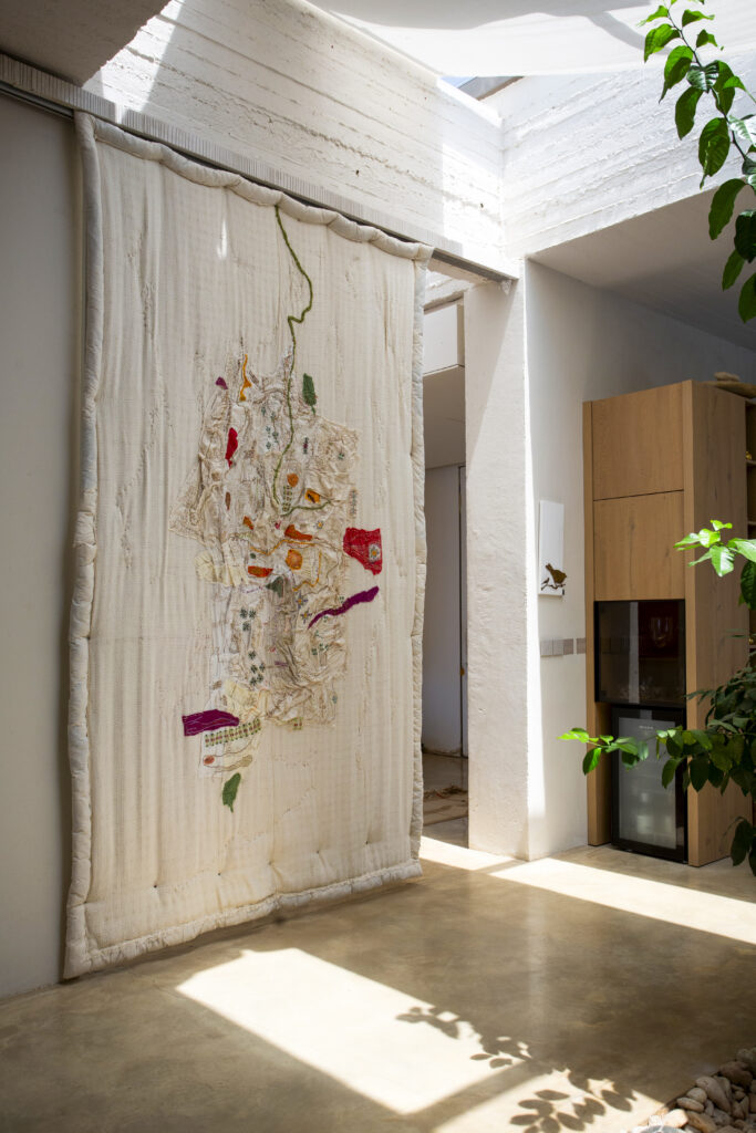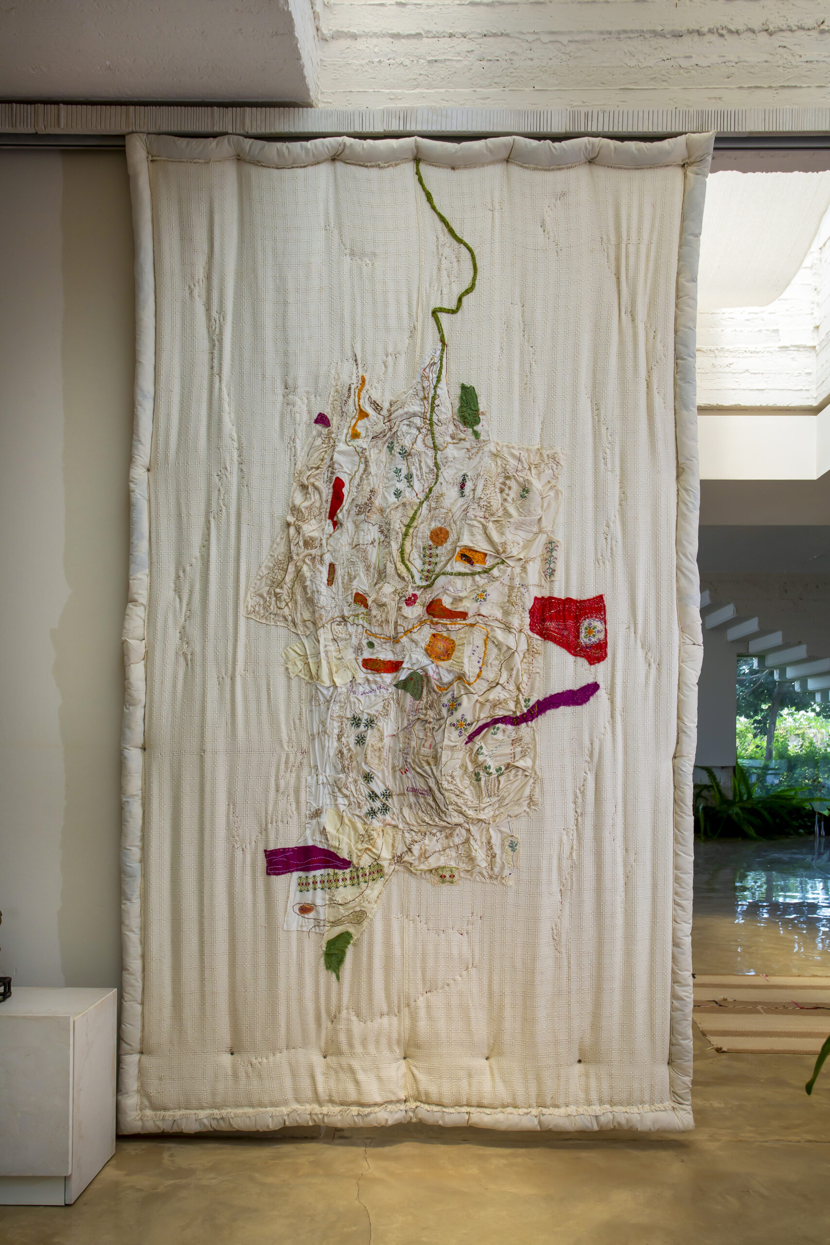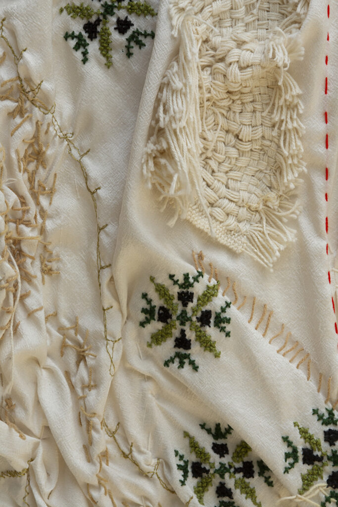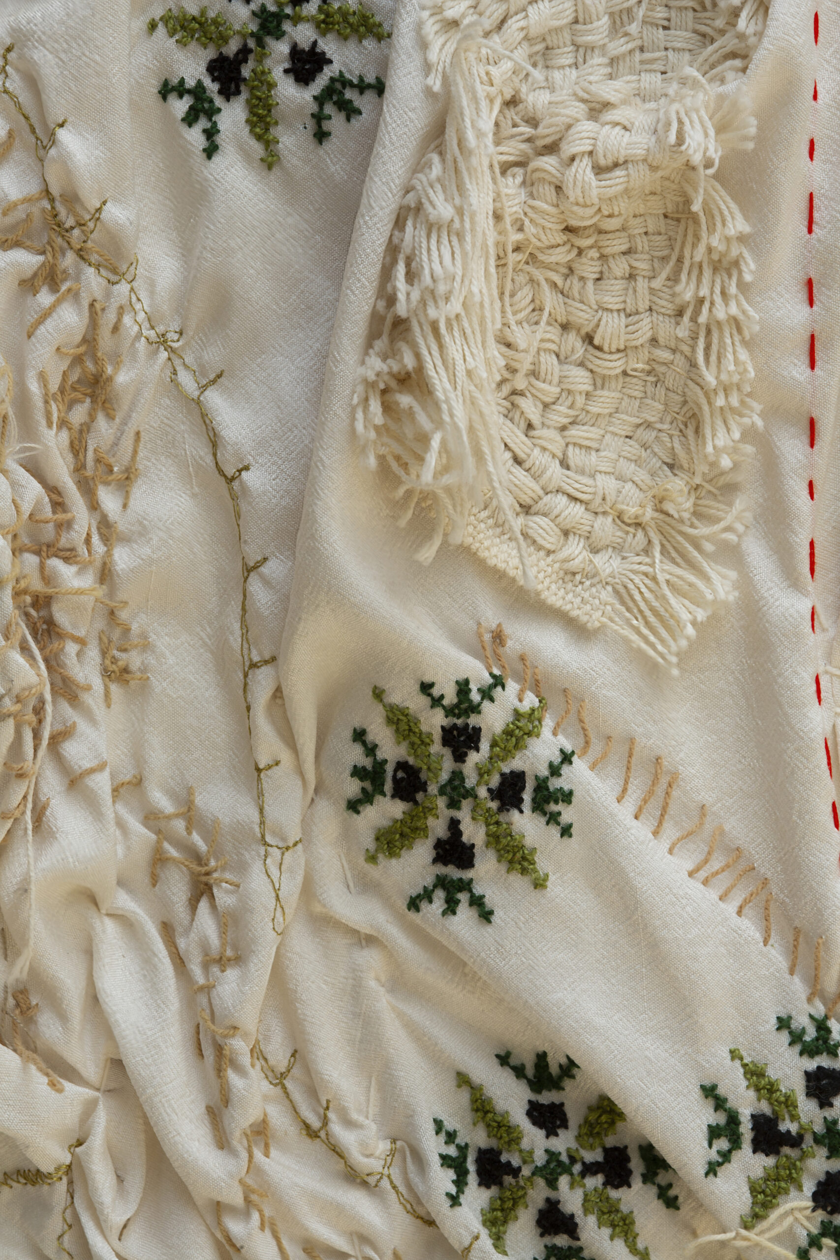 In this sprawling embroidery piece, against my stitched backdrop of mountains and valleys, hills and fields, emerges a story of resistance. For countless generations, Palestinians have foraged for and harvested the fruits of their land, from the naturally growing tumble thistle (Akkoub), medicinal thyme (Za’atar), and wild sage (Meramieh) to the cultivated olive, orange, and watermelon. Yet, like all other facets of their lives, their autonomy over their own food is under occupation. In addition to confiscating their farmlands and uprooting thousands of generational fruit trees, Israel imposes oppressive laws forbidding Palestinians from picking and growing the plants that comprise their culinary, medicinal, and cultural traditions. Despite this, Palestinians continue to find ways to resist. To symbolize this struggle, I’ve created original motifs of these plants, disrupting the landscape with their rich reds, warm oranges, verdant greens, and deep purples in an act of rebellion against the background’s muted color palette. Transcending mere fabric, this tapestry stands as a tribute to the enduring spirit of the Palestinian people and their ongoing struggle for survival, self-determination, and freedom.