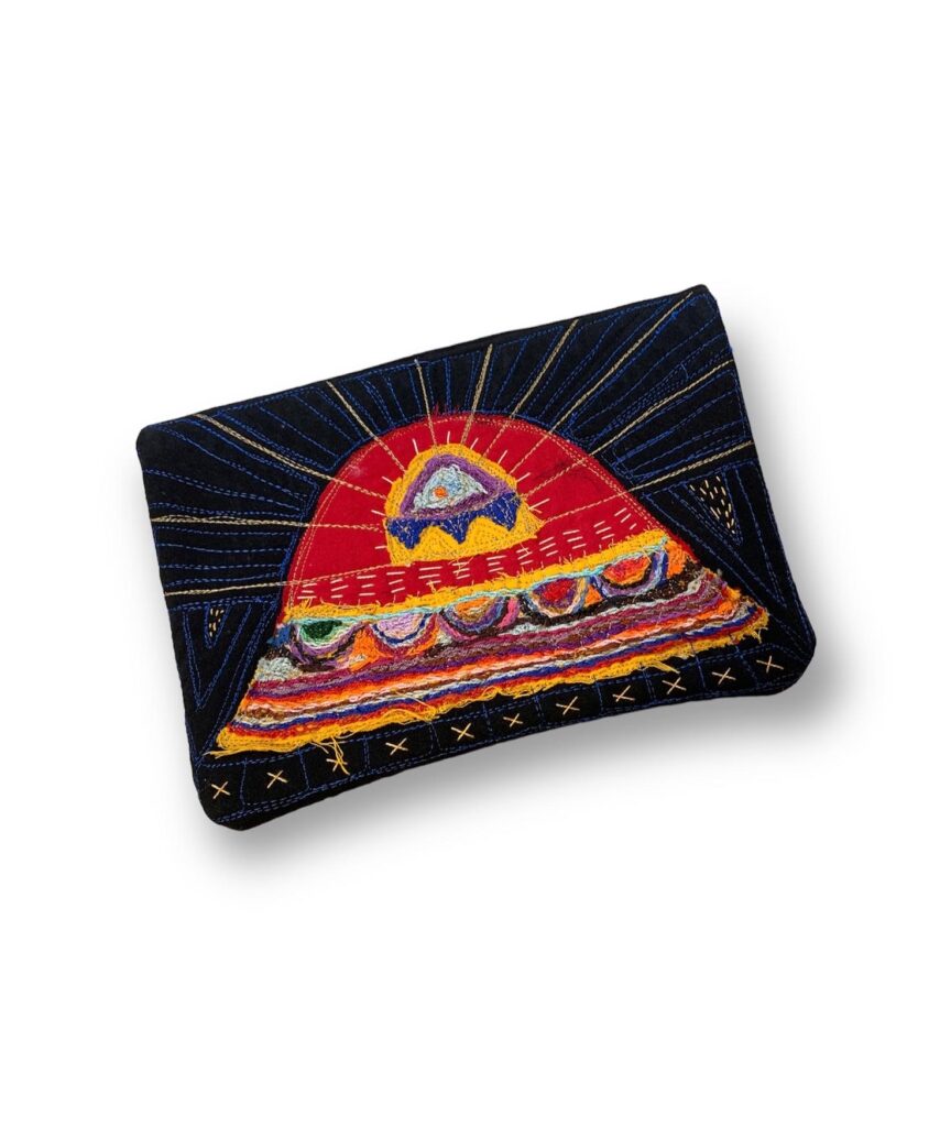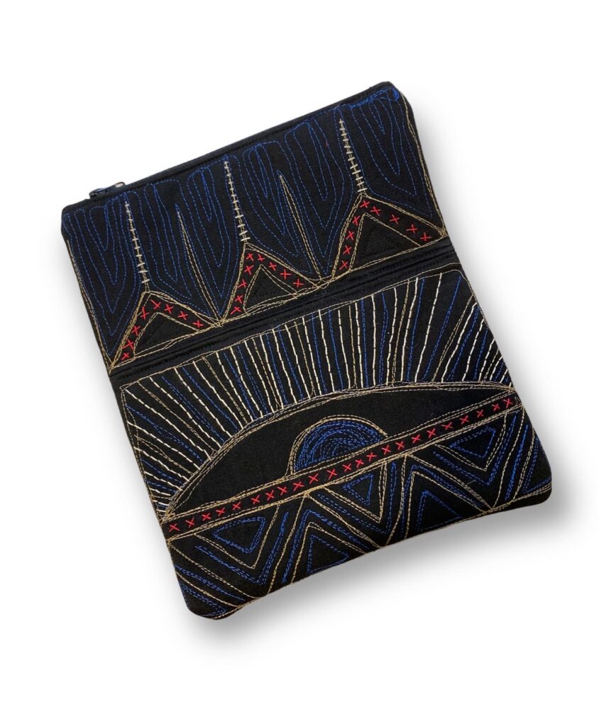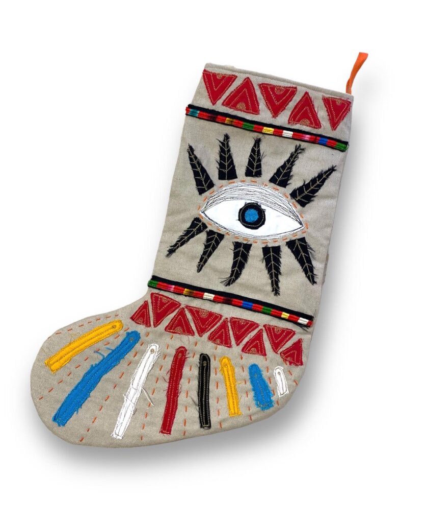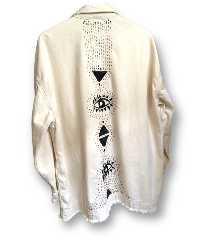 Jordanian Bedouin homes are filled with geometrical designs, colors, and use of talismans. My goal was to transform these very traditional inspirations into a modern work of art using stitching and block printing.